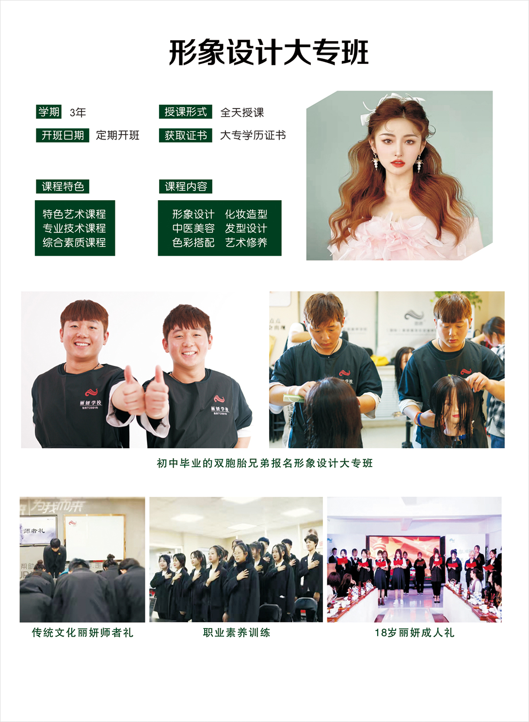 形象设计大专班(脱产)是丽妍学校特色专业之一,集美容、美发、化妆造型、美甲、管理、设计等专业学科于一体的学历教育,毕业后颁发国家承认的大专文凭。培训以就业为导向,适应市场需求,注重素质培养,保证专业质量,实行“一张学历文凭,多种技能证书”,课程理论传授与学生职业技能培训同步。